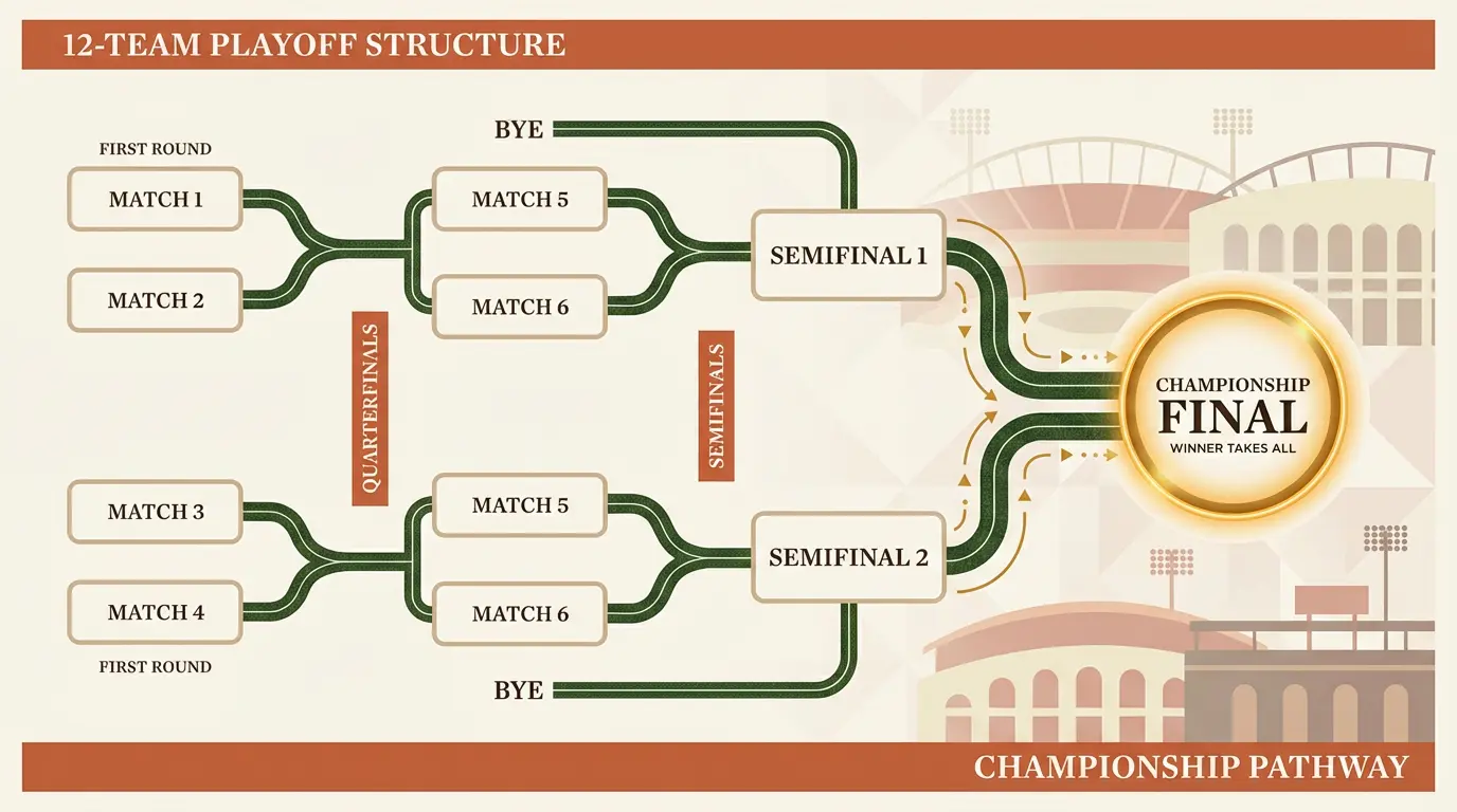 El College Football Playoff dejó atrás el modelo de cuatro equipos para adoptar un bracket de 12 que redefinió la estructura competitiva y, con ella, los mercados de apuestas. El formato funciona así: los cinco campeones de las conferencias con mejor clasificación obtienen plaza automática, y los cuatro primeros reciben cabezas de serie (seeds 1 a 4) con ventaja de campo en los cuartos de final. Los siete restantes son seleccionados at-large por el comité de selección.